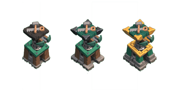 Depois de melhorias para além do Nível 2, a Cabana do Construtor se defenderá ativamente com uma torre armada que atira nos inimigos invasores.
