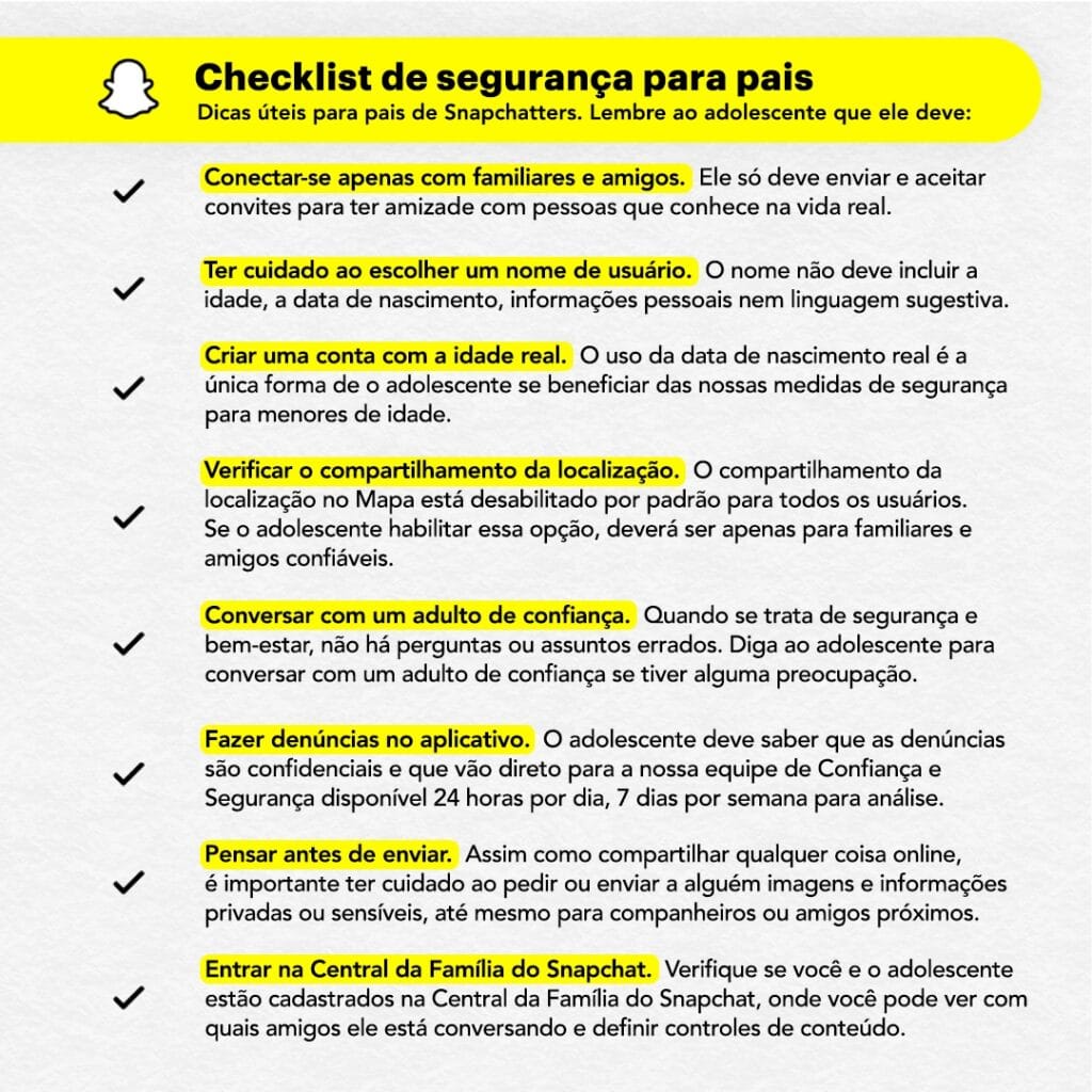 “O Snapchat foi criado intencionalmente para ser um lugar seguro para os amigos se comunicarem e se divertirem”, disse Marta Fusté, Market Development Lead da Snap Inc. na América Latina. “Estamos comprometidos em tornar nosso aplicativo mais seguro e melhorá-lo constantemente nos próximos meses, com proteções adicionais para Snapchatters adolescentes e suporte para os pais”.