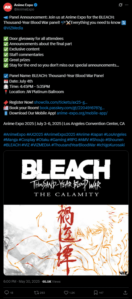 A espera por novas informações sobre Bleach: Thousand-Year Blood War – Part 4: The Calamity pode estar perto do fim. A organização da Anime Expo 2025 confirmou que um painel especial dedicado à obra de Tite Kubo acontecerá no dia 4 de julho, com anúncios sobre a parte final do anime.