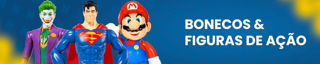 - Boneco Superman 30cm – SUNNY (R$81,99): Junte-se ao Superman em suas aventuras! Boneco articulado com capa de tecido, igual aos filmes e HQs.