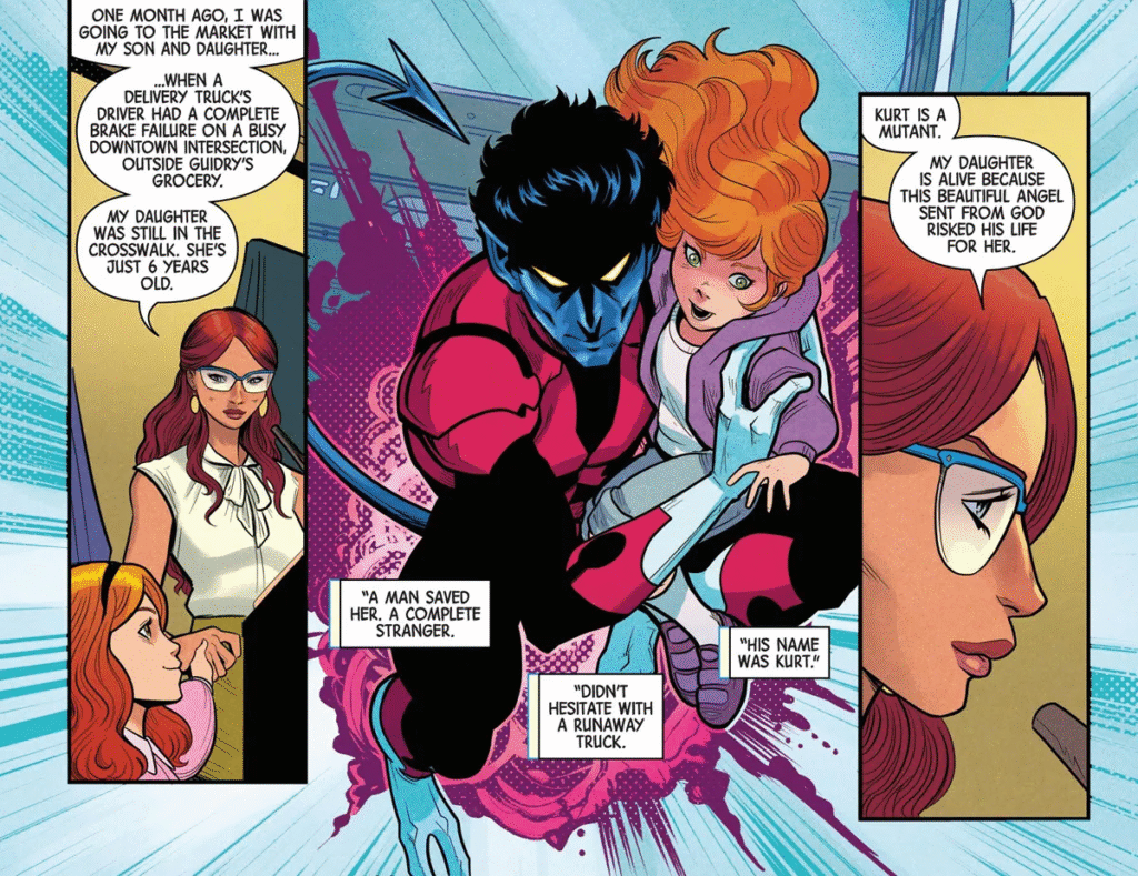 Uncanny X-Men #16, de Gail Simone, David Marquez e Luciano Vecchio, deixa esses paralelos claros. A história começa com uma coletiva de imprensa em Nova Orleans. MacKenzie DeNeer, uma cidadã local, fala sobre ataques mutantes recentes. Ela destaca como Noturno dos X-Men salvou sua filha.