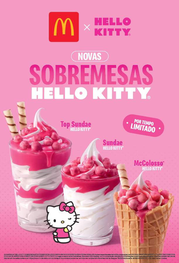 As novas sobremesas têm um sabor irresistível. Elas também trazem a estética única da personagem. Isso vai conquistar tanto no visual quanto no paladar. Os novos Sundae, Top Sundae e McColosso Hello Kitty são versões fofas dos clássicos. Eles têm a magia cor-de-rosa da Hello Kitty. A receita inclui bebida láctea sabor baunilha. Também tem cobertura de tutti frutti. Além disso, confeitos rosas de tutti frutti. O McColosso e o Top Sundae ainda trazem os tradicionais bijus.