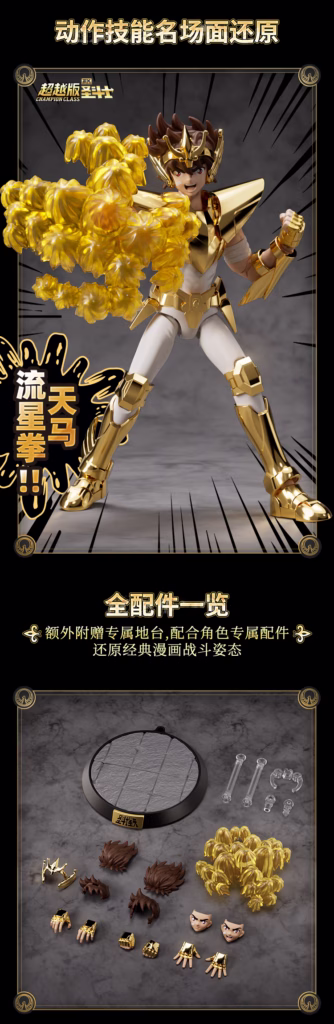 - Acabamento Premium: O “Pégaso Dourado” contará com um acabamento metalizado de alto brilho, simulando o momento em que a armadura de bronze brilha como ouro durante a Batalha das Doze Casas e em Poseidon.